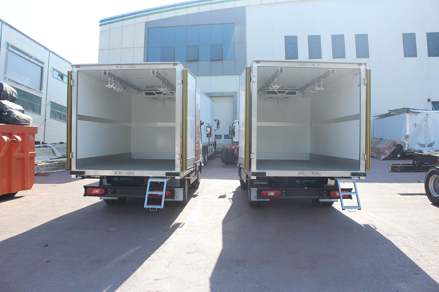 Gencer Kasa olarak, karkas et taşımacılığı için özel askı sistemleriyle donatılmış frigorifik kasalar üretiyoruz. Araçlarınıza uygun duvar kalınlığı, soğutucu modeli, zemin ve kapı seçeneklerini belirleyerek, hijyenik ve dayanıklı çözümler sunuyoruz.
